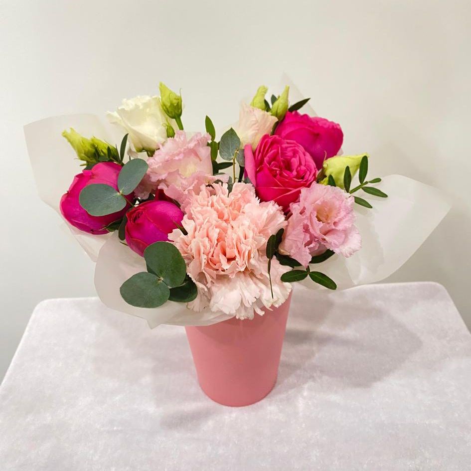 Состав:гвоздика,цвет-персиковый,1 шт., зелень,0,3 шт., роза кустовая,цвет-розовый,1 шт., стаканчик,1 шт., эустома,цвет-белый,1 шт.
