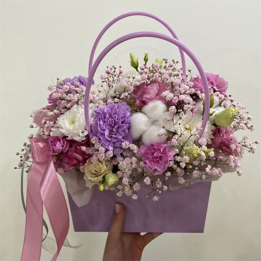 Состав:Гвоздика кустовая,цвет-розовый,3 шт., гвоздика,цвет-сиреневый,3 шт., гипсофила,цвет-розовый,1 шт., коробка сумочка мал,1 шт., лента,2 шт., хлопок,3 шт., хризантема кустовая балтика,цвет-белый,1 шт., эустома,цвет-розовый,1 шт.