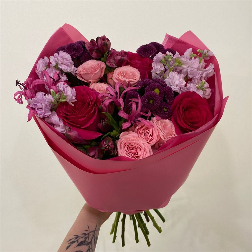 Состав:альстромерия,цвет-розовый,2 шт., лента,1 шт., маттиола,цвет-розовый,2 шт., Нерине,цвет-розовый,2 шт., пленка матовая,1 шт., роза кустовая,цвет-розовый,2 шт., роза,цвет-розовый,3 шт., тишью,1 шт., Хризантема сантини понпон,цвет-бордовый,3 шт.