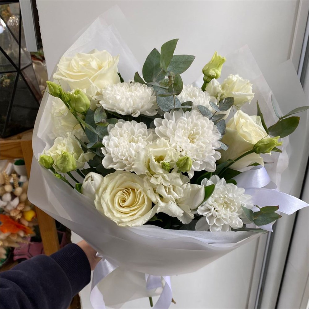 Состав:зелень,1 шт., лента,2 шт., пленка матовая,1 шт., роза,цвет-белый,3 шт., тишью,1 шт., хризантема кустовая балтика,цвет-белый,1 шт., эустома,цвет-белый,1 шт.