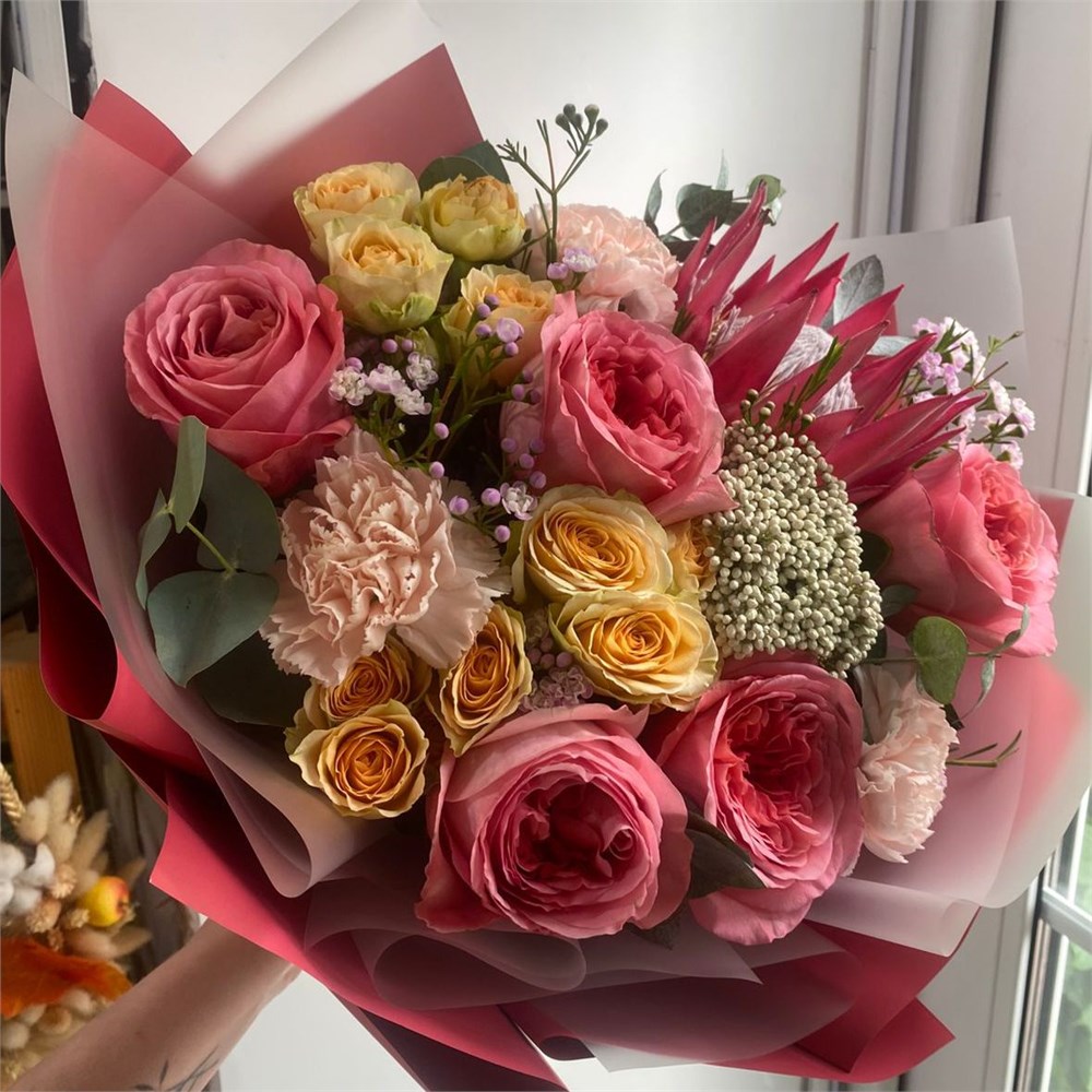 Состав:гвоздика,цвет-кремовый,3 шт., зелень,1 шт., лента,1 шт., озотамнус,цвет-белый,1 шт., пленка матовая,1 шт., протея,1 шт., роза кустовая,цвет-кремовый,3 шт., роза,цвет-розовый,5 шт., Хамелациум,цвет-сиреневый,3 шт.